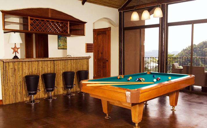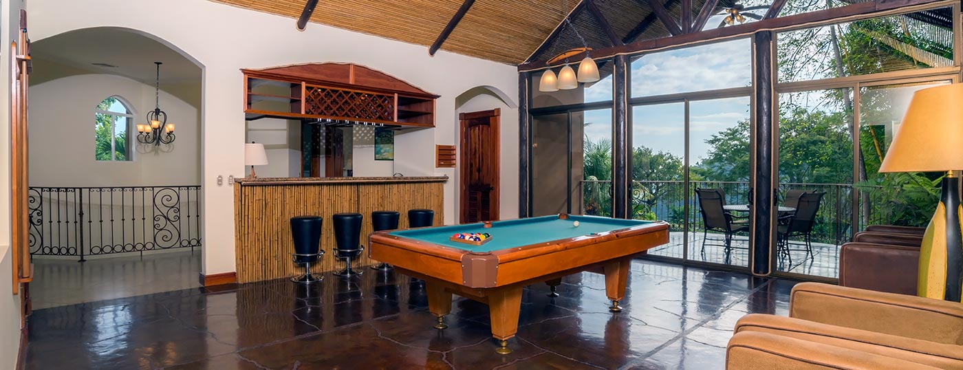 Casa Pacifica has an upstairs gathering game room with vaulted bamboo ceilings, a great bar and 50" plasma TV. This room has a great view to the Herradura Bay and features a custom pool table and other game tables.