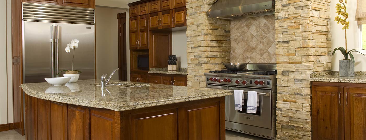 The kitchen with wood and stone accents is fully equipped including SubZero and Wolf appliances. 48" refrigerator and wine and beer cooler.