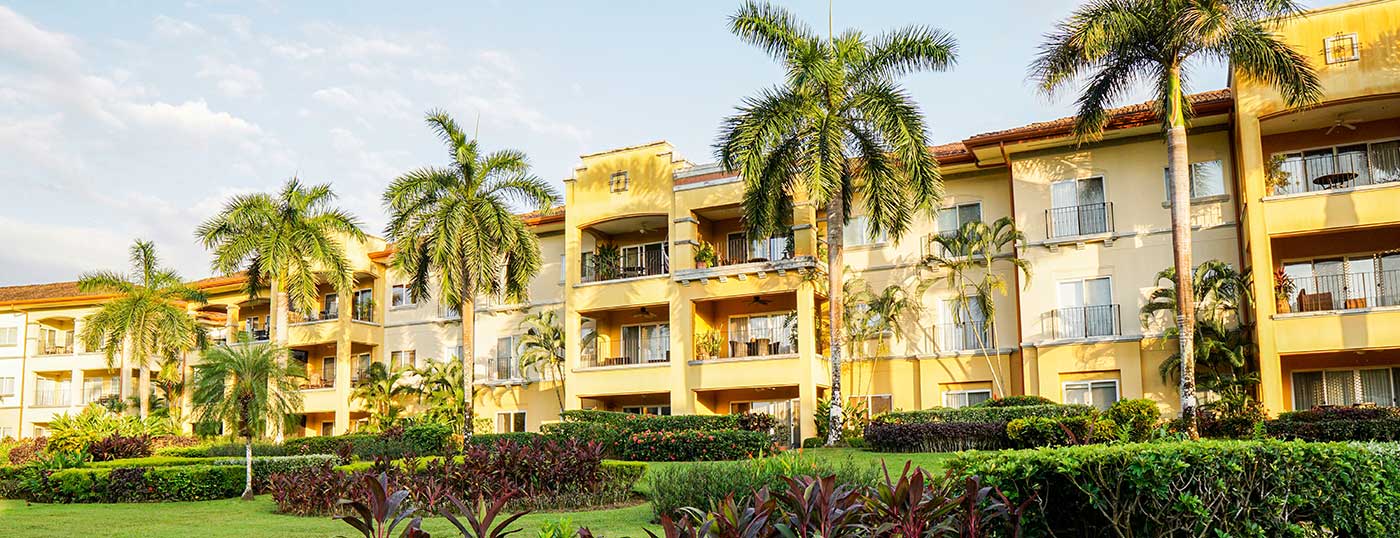 The Del Mar Condominiums feature a striking contrast between Mediterranean architectural design and the delicate landscape that characterizes this community. Del Mar is a haven for recreation and active living within Los Suenos.